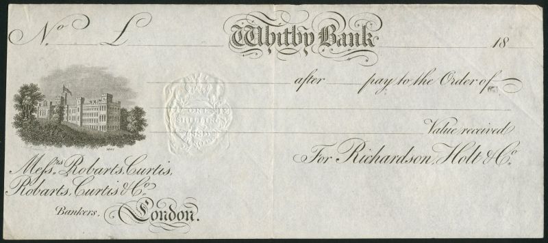 Whitby Bank ( Richardson, Holt & Co.), unissued 1 guinea , 181-, black and white, stately house top left, also an unissued sight bill dated 18-