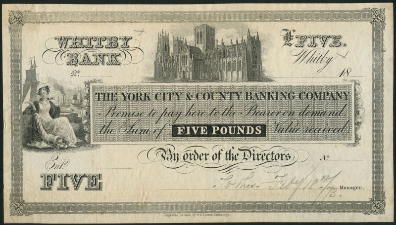 Whitby Bank, York City & County Banking Company, proof £5, Whitby, 18-, black and white, York Minster top centre, maiden (Abundance) with corncopia at left