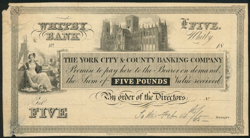 Whitby Bank, York City & County Banking Company, proof £5, Whitby, 18-, black and white, York Minster top centre, maiden (Abundance) with corncopia at left