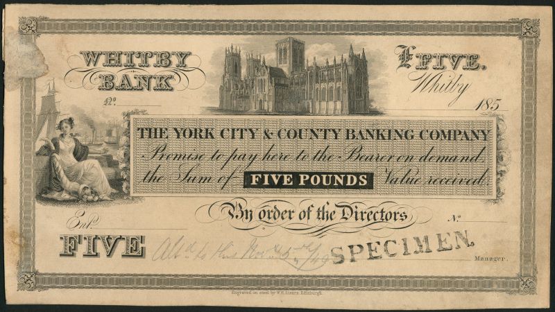 Whitby Bank, York City & County Banking Company, proof £5 on card, Whitby, 185-, black and white, York Minster top centre, maiden (Abundance) with corncopia at left