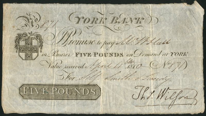 York bank (Wilson Smith & Tweedy), £5, 4 April 1810, serial number 871, black and white, arms at left, manuscript signature of Thomas Wilson low right