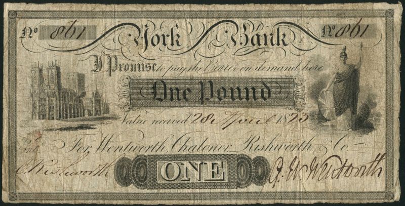 York Bank (Wentworth, Chaloner, Rishworth & Co.), £1, 28 April 1823, serial number 861, black and white, York Minster top left, Britannia top right, manuscript signature of Wentworth low right
