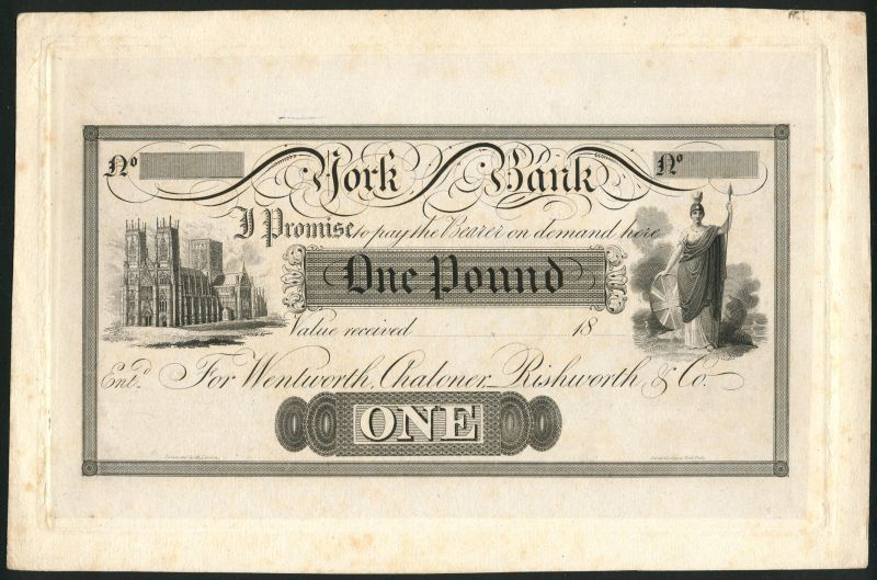 York Bank (Wentworth, Chaloner, Rishworth & Co.), proof £1 on large format card, 18- black and white, York Minster top left, Britannia top right