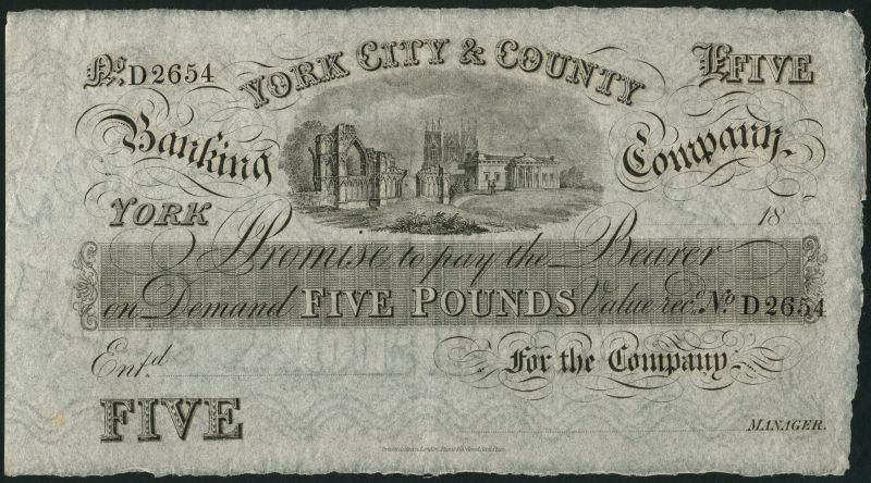 York City & County Banking Company, unissued £5, 18-, black and white, Fountains Abbey top centre
