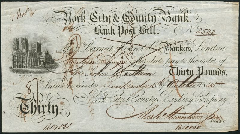York City & County Bank, post bills (5) for £10,20,30,50,100, 1845, black and white, York Minster at left, manuscript signatures and annotations, also a proof and an issued sight bill