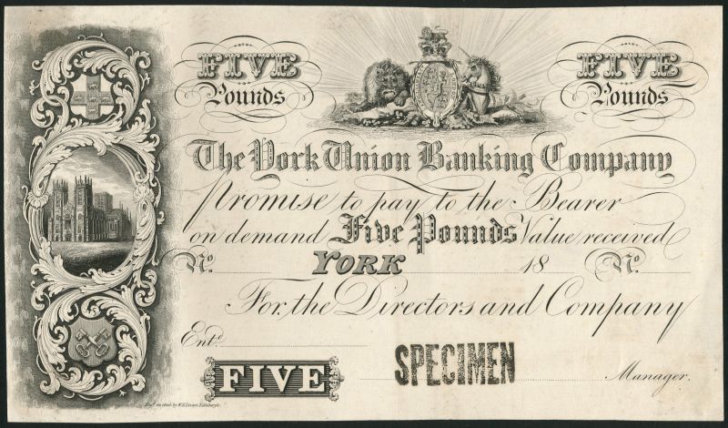 York Union Banking Company, proof £5, 18-, black and white, Royal arms top centre, York Minster and arms at left