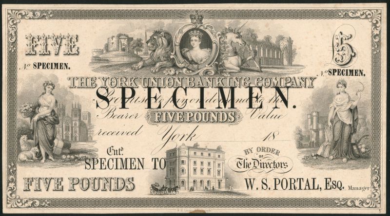 York Union Banking Company, proof £5, 18-, black and white, Queen Victoria, lion and unicorn top centre, allegorical maiden at left and right, bank building low centre,