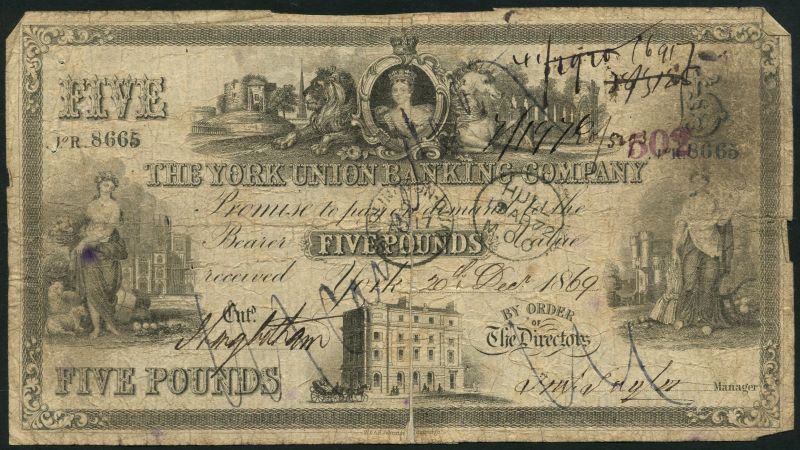 York Union Banking Company, £5, 20 December 1869, serial number R 8665, black and white, Queen Victoria, lion and unicorn top centre, allegorical maiden at left and right, bank building low centre, manuscript signatures below, reverse black and white, maiden and eagle at centre, value and arms in field