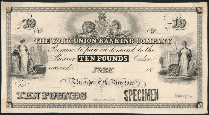 York Union Banking Company, proof £10, 18-, black and white, Royal arms, lion and unicorn top centre, allegorical maiden at left and right (Abundance and Britannia)