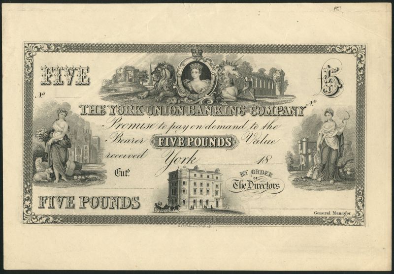 York Union Banking Company, proof £5, 18-, black and white, arms, lion and unicorn top centre, allegorical maiden at left and right (Abundance and Britannia), bank building low centre