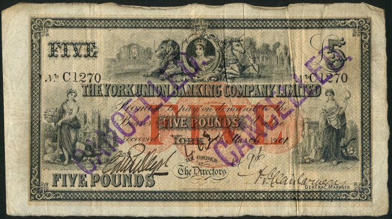York Union Banking Company Limited, £5, 7 March 1901, serial number C 1270, black and white, arms, lion and unicorn top centre, allegorical maiden at left and right (Abundance and Britannia), value in red protector at centre, two manuscript signatures below, reverse blue and white, eagle and cherub at centre