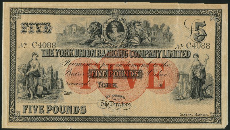York Union Banking Company Limited, a part issued £5, 19-, serial number C 4088, black and white, arms, lion and unicorn top centre, allegorical maiden at left and right (Abundance and Britannia), value in red protector at centre, reverse blue and white, eagle and cherub at centre