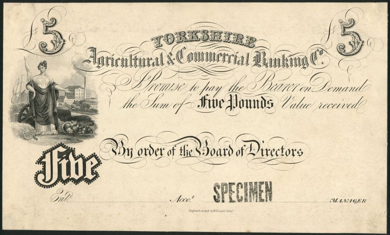 Yorkshire Agricultural and Coomercial Banking Co., proof £5, ND, black and white, allegorical maiden at left (Industry), value top left and right