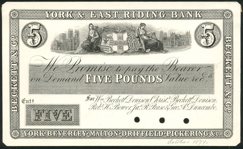 York & East Riding Bank (Denison, Denison,Bower,Pease & Duncombe), proof £5 on card, 4 November 1909, serial number 75350, black and white, value in blue protector at centre, maidens and arms top centre, church top left and right, value top left and right, manuscript signature low right