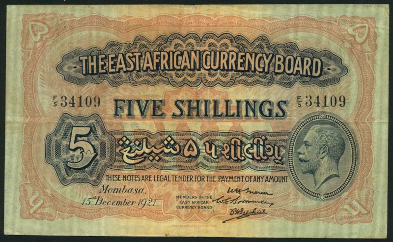 (x) The East African Currency Board, 5 Shillings, Mombasa, 15 December 1921, serial number F/5 34109, blue-black on orange-brown underprint, King George V at lower right, value at lower left, reverse lion at centre
