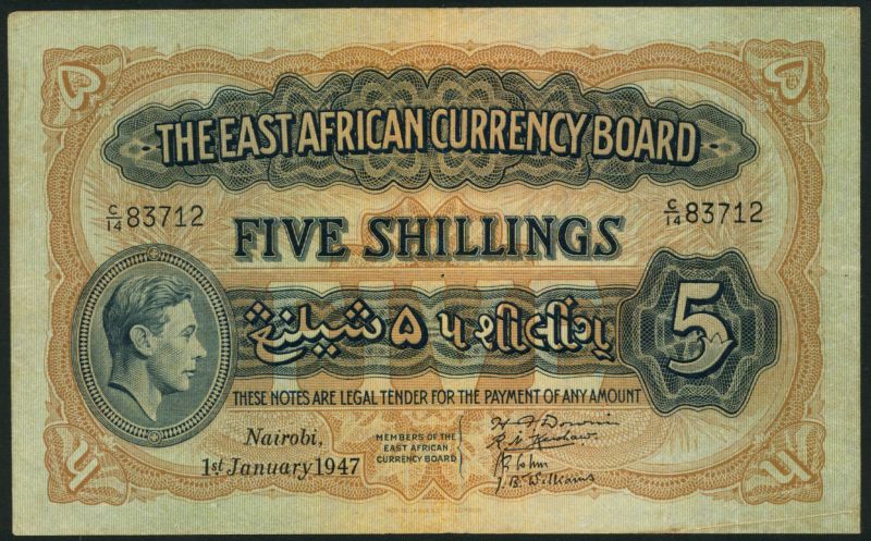 (x) The East African Currency Board, 5 Shillings, Nairobi, 1 January 1947, serial number C/14 83712, blue-black on orange-brown underprint, King George VI at lower left, value at lower right, reverse lion at centre