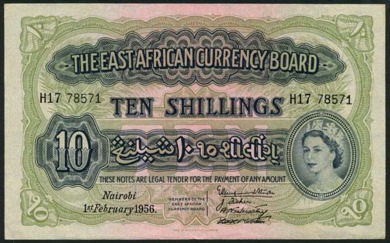 (x) The East African Currency Board, 10 Shillings, Nairobi, 1 February 1956, serial number H17 78571, deep blue on green and pink underprint, Queen Elizabeth II at lower right, value at lower left, reverse lion at centre