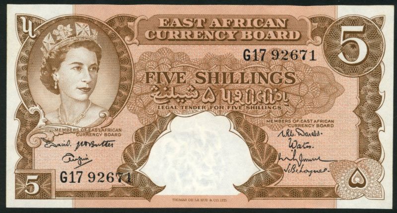 (x) East African Currency Board, 5 Shillings, ND (1958-60), serial number C1 78517, brown on multicoloured underprint, Queen Elizabeth II at upper left, reverse floral design