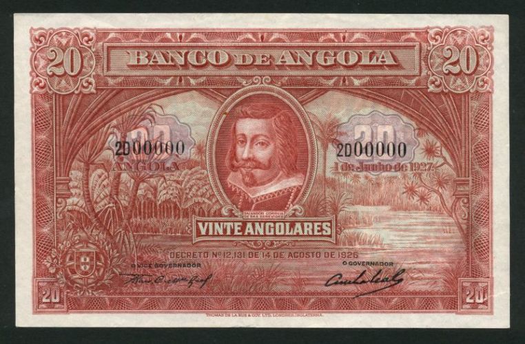 (x) Banco de Angola, specimen 20 angolares, 1 June 1927, serial number 2D00000, red-purple, pale lilac and green, Benevides at centre, river and jungle in field, arms low left, reverse red, hippopotamus at centre, value top left and right