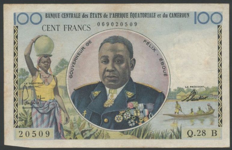 (x) Banque Centrale des Etats de L'Afrique Equatoriale et du Cameroun, 100 Francs, ND (1961-62), serial number Q.28 069020509, code letter "B", blue and multicoloured, Felix Eboue at centre, reverse man at right, cargo ship at centre