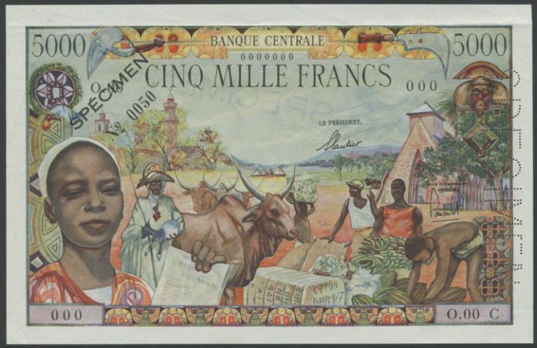 (x) Banque Centrale des Etats de L'Afrique Equatoriale, specimen 5000 Francs, ND (1963), serial number O.0000000, code letter "C", multicoloured, girl at right, village scene at centre, reverse man smoking pipe at right, tractor logging at centre, overprinted SPECIMEN No 0050 in black on obverse and perforated SPECIMEN at right