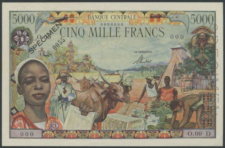 (x) Banque Centrale des Etats de L'Afrique Equatoriale, specimen 5000 Francs, ND (1963), serial number O.0000000, code letter "D", multicoloured, girl at right, village scene at centre, reverse man smoking pipe at right, tractor logging at centre, overprinted SPECIMEN No 0055 in black on obverse and perforated SPECIMEN at right