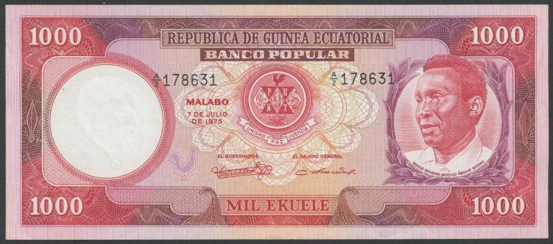 (x) Banco Popular, Equatorial Guinea, 25,50,100,500,1000 ekuele, 7 July 1975, all President Biyogo at right , also 25, 100 (2),500 and 1000 ekuele, all 7 July 1975 (second issue),