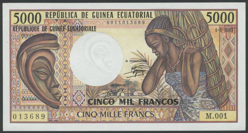 (x) Banque des Etats de L'Afrique Centrale, Equatorial Guinea, 500 francs, 1985, prefix H01, pink and multicoloured, 1000 frrancs, 1985, prefix G01, blue and 5000 francs, 1985, prefix M.001, brown and multicoloured, maiden with basket of reeds at right