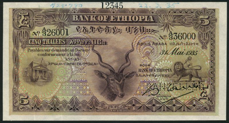 (x) Bank of Ethiopia specimen 5 thalers, 31 May 1935, serial number A/3 26001-36000, purple & multicoloured, Greater Kudu at centre, Royal Lion of Judah at right, bank building at left, reverse lilac and green and pale orange, value at centre