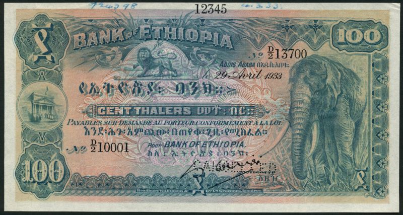 (x) Bank of Ethiopia specimen 100 thalers, 29 April 1933, serial number D/2 10001-D/2 13700, blue-green & multicoloured, Royal Lion of Judah at top left centre, elephant at right, bank building at left, reverse purple and pink-red, value at centre