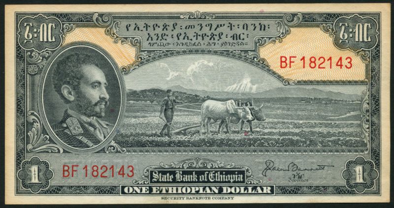 (x) State Bank of Ethiopia, $1 and $5, ND (1945), black and white, pale salmon panel top left and right, Emperor Haile Selassie at left, Manery and Blowers signatures respectively