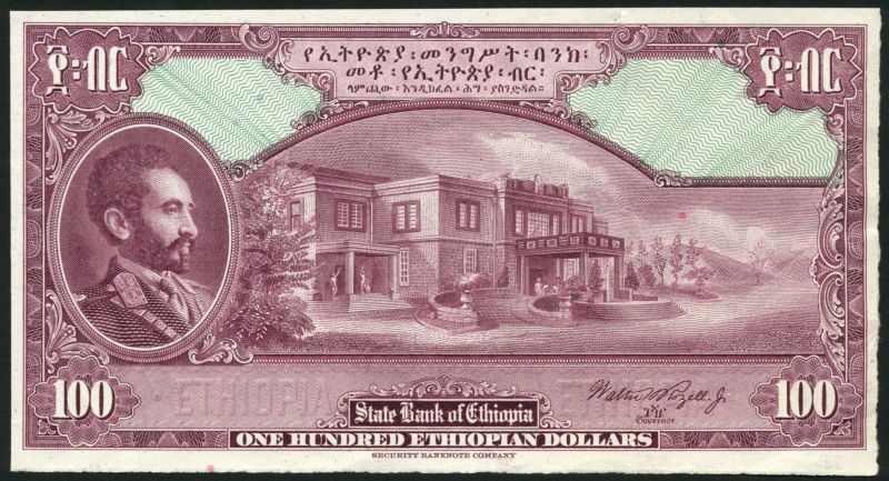 (x) State Bank of Ethiopia, a uniface colour trial $100, ND (type of 1945), no serial numbers, purple and pale green, Emperor Haile Selassie at left, the Imperial Palace at centre, value at each corner, Rozell signature low right