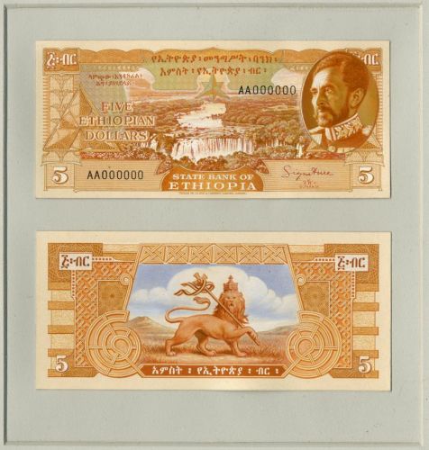 (x) State Bank of Ethiopia, a green leather and gold presentation album of hand executed proposed designs for an issue of currency ,ND (c.1961), and comprising 1 Ethiopian dollar, green, Parliament building, 5 dollars, brown, the Blue Nile Falls, 10 dollars, railway terminus, 20 dollars, harbour on the Red Sea, 50 dollars, blue, cattle, 100 dollars, violet, the Posts and Telegraph building, 500 dollars, green, the Imperial Palace, all have the portrait of Emperor Haile Selassie and the Star of Ethiopia, all have the Lion of Judah on reverse, all have serial number AA 000000, there is one additional essay for a 1 dollar with modified design