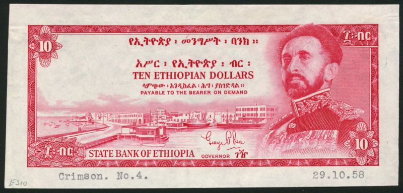 (x) State Bank of Ethiopia, a group of six uniface progressive proofs for the $10, ND (1958), obverses (2), one in red and white with portait of Haile Selassie at right, Massawa harbour at left, one partial background. One reverse in red and white with the Royal Lion of Judah at centre, three with only partial background detail