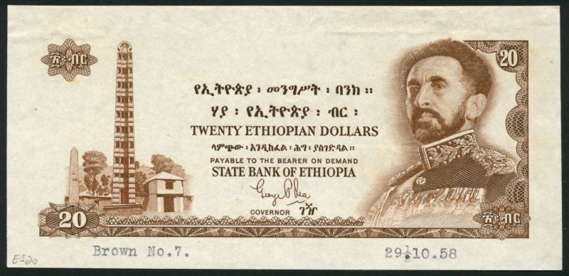 (x) State Bank of Ethiopia, a group of six uniface progressive proofs for the $20, ND (1958), obverses (4), one in brown and white with portait of Haile Selassie at right, a monument at Axum at left, three obverse proofs with partial background detail only, one reverse in brown and white with the Royal Lion of Judah at centre, one reverse with partial background only