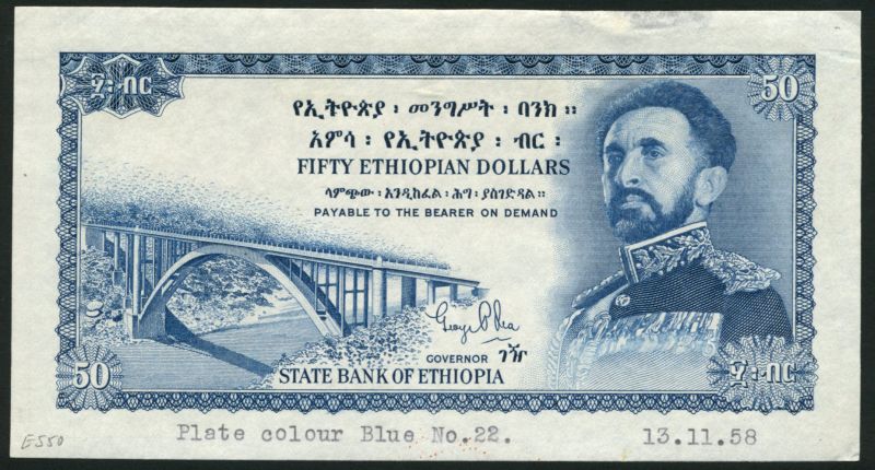 (x) State Bank of Ethiopia, a group of eight uniface progressive proofs for the $50, ND (1958), obverses (4), one in blue and white with portait of Haile Selassie at right, a bridge over the Blue Nile at left, three obverse proofs with partial background detail only, one reverse in blue and white with the Royal Lion of Judah at centre, three reverses with partial background only