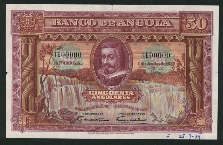 (x) Banco de Angola, colour trial 50 angolares, 1 June 1927, serial number IE 00000, purple, and green, Salvador Correia at centre, falls in background, arms at top left, columns at left and right, reverse purple and green, leopard reclining at centre, value top left and right