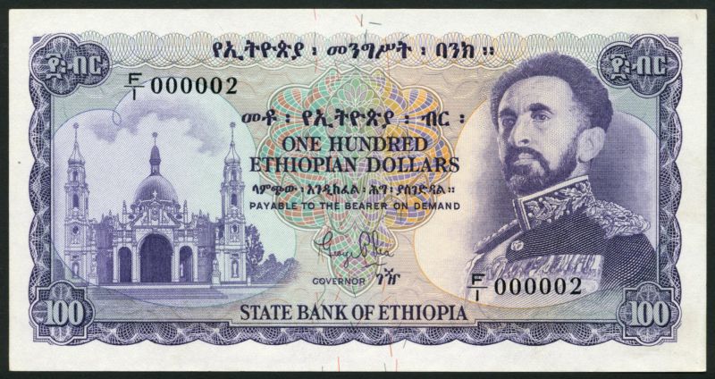 (x) State Bank of Ethiopia, $100, ND (1961), serial number F/1 000002, purple and multicoloured, Emperor Haile Selassie at right, the Holy trinity Church in Addis Ababa at left, Governor signature, reverse purple and multicoloured, the Royal lion of Judah at centre, value at each corner