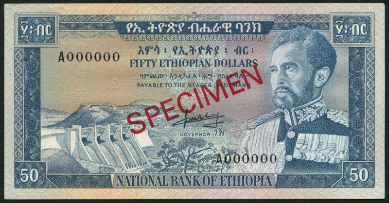 (x) National Bank of Ethiopia, specimen $1, green and multicoloured, prefix A, also specimen $5, brown and multicoloured, prefix B,also specimen Red, $10 prefix A and specimen $50, blue, prefix A, all ND (1966), Emperor Haile Selassie at right.