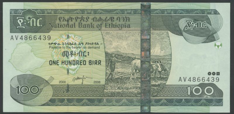 (x) National Bank of Ethiopia, a group of the EE 1989 (1987) to EE1995 (2008) Issues comprising 1 Birr, 1997, signature 5, black on multicoloured underprint, young man at right, reverse waterfalls; 5 Birr (2), 1997, signature 5 and 2000, signature 6, both blue and multicoloured, man picking coffee beans at right, reverse kudu and caracal; 10 Birr (4), 2000, signature 6 (2), 2003, 2008, all brown and multicoloured, woman weaving basket at right, reverse tractor,; 50 Birr (5), 1997, signature 5, 2000, 2004 (2) and 2008, orange-brown and multicoloured, farmer with oxen at centre, reverse castle, , and 100 Birr (4), 2000, signature 6, 2004, 2006 and 2008, green and multicoloured, farmer with oxen at centre, reverse man with microscope