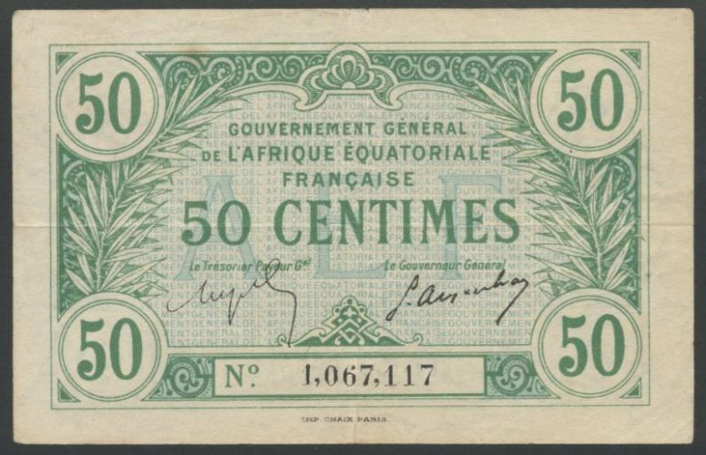 No.1,067,117 ND (1917), 50 Centimes, No.1,067,117 ND (1917), emergency issue, green on blue underprint, watermark laurel leaves, value in all four corners, at left-hand side signed by le trésorier payeur de l’Afrique Equatoriale Francaise, Pujol and at right-hand side by Gouverneur général de l’AfriqueÉquatoriale française, Gabriel Angoulvant; reverse a monogram AEFT, stands for Afrique Equatoriale Francaise trésorier in guilloche at lower centre.