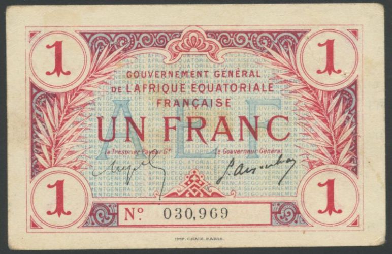 (x) Gouvernement General de l'Afrique Equatoriale Francaise, 50 Centimes, ND (1917), emergency issue, green on blue underprint, watermark laurel leaves, and 1 Franc, ND (1917), emergency issue, red on blue underprint, without watermark, both value in all four corners, reverse ALF in guilloche at lower centre