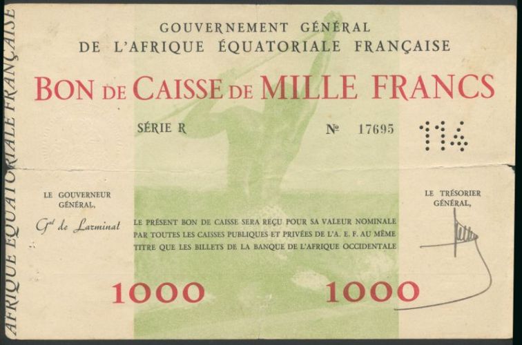 (x) Gouvernment General de L'Afrique Equatoriale Francais, 1000 Francs, ND (1940), serie R, serial number 17695, pale green on cream paper, man rowing boat at centre, value in red at lower right and lower left, reverse, "Cadre de Controle" in rectangular lined boxes