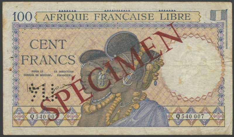 (x) Afrique Francaise Libre, 100 Francs, ND (1941), and specimen 100 Francs, ND (1941), overprinted SPECIMEN in red on obverse and reverse and perforated 114, both dark brown, lilac and multicoloured, two women at centre, reverse woman with basket