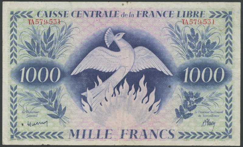 (x) Caisse Centrale de la France Libre, 1000 Francs, Law of 1941, red serial number TA579,531, dark blue on green and pink underprint, phoenix rising from the flames, reverse house, cart and tree before and after reconstruction
