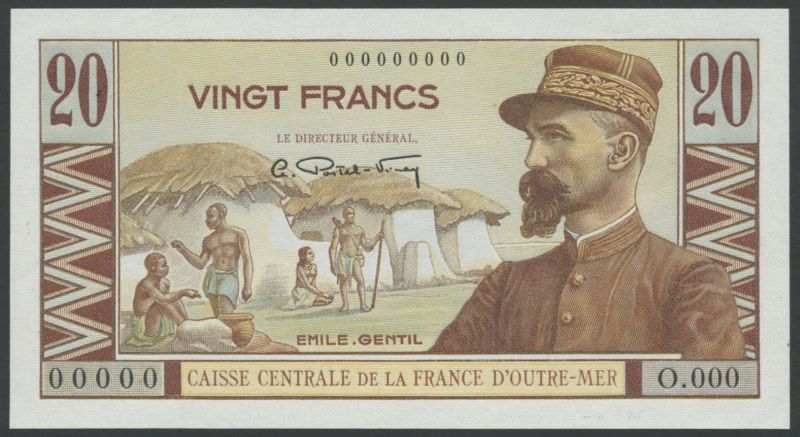 (x) Caisse Centrale de la France d'Outre-Mer, 20 Francs, ND (1947), uniface proof, serial number O.000000000, brown and multicoloured, Emil Gentil at right, villagers at left