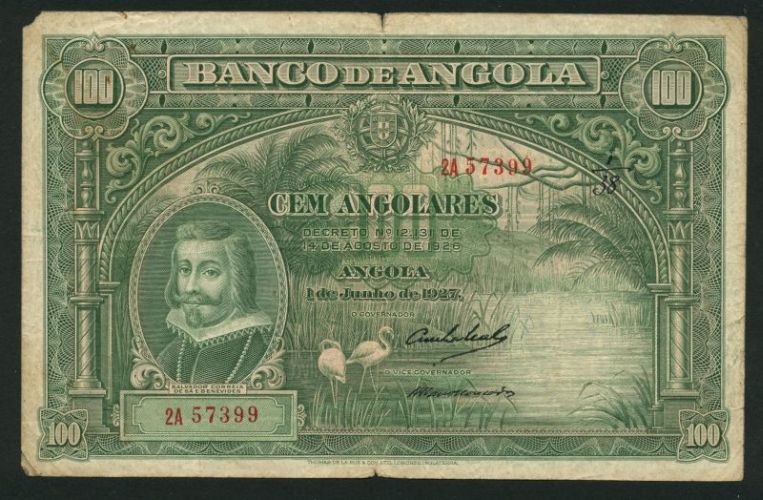 (x) Banco de Angola, 100 angolares, 1 June 1927, red serial number 2A 57399, green and pale pink, Salvador Correia at left, lagoon with flamingos in field, arms top centre, column at left and right, value at each corner, reverse green, crocodile at centre, value top left and right
