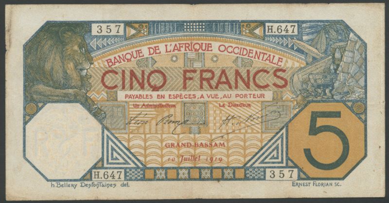 (x) Banque De L'Afrique Occidentale (French West Africa), 5 francs, Grand-Bassam, 10 July 1919, prefix H, No. 647-357 orange, blue and red, lion top left, allegorical symbols top right