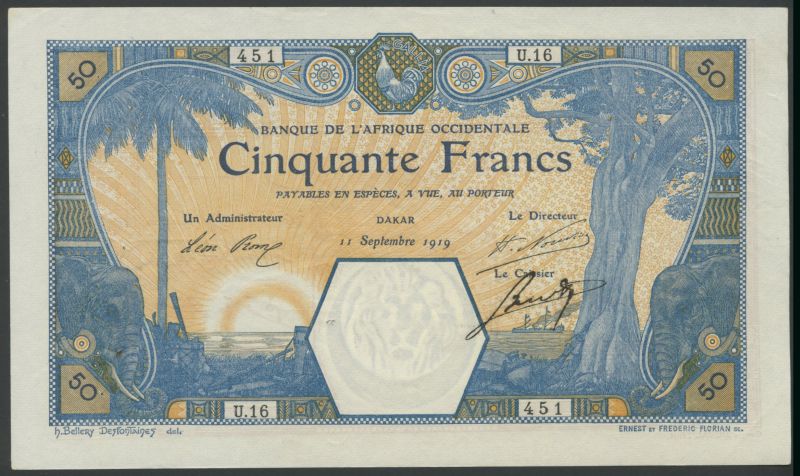 (x) Banque De L'Afrique Occidentale (French West Africa), 50 francs (2), Dakar, 11 September 1919, serial number U.16-451, orange and blue, elephant and allegorical symbols at left and right, cock top centre, two printed signatures, manuscript signature of Le Caissier low right