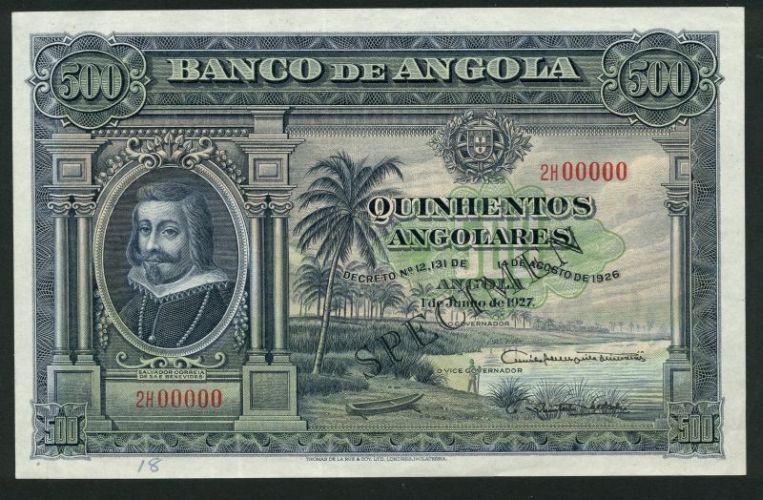 (x) Banco de Angola, specimen 500 Angolares, 1 June 1927, red serial number 2H00000, deep blue on green underprint, Salvador Correia at left, shoreline with palm trees at right, arms top right centre, value right centre and at each corner, reverse eagle in oval frame, value top left and right